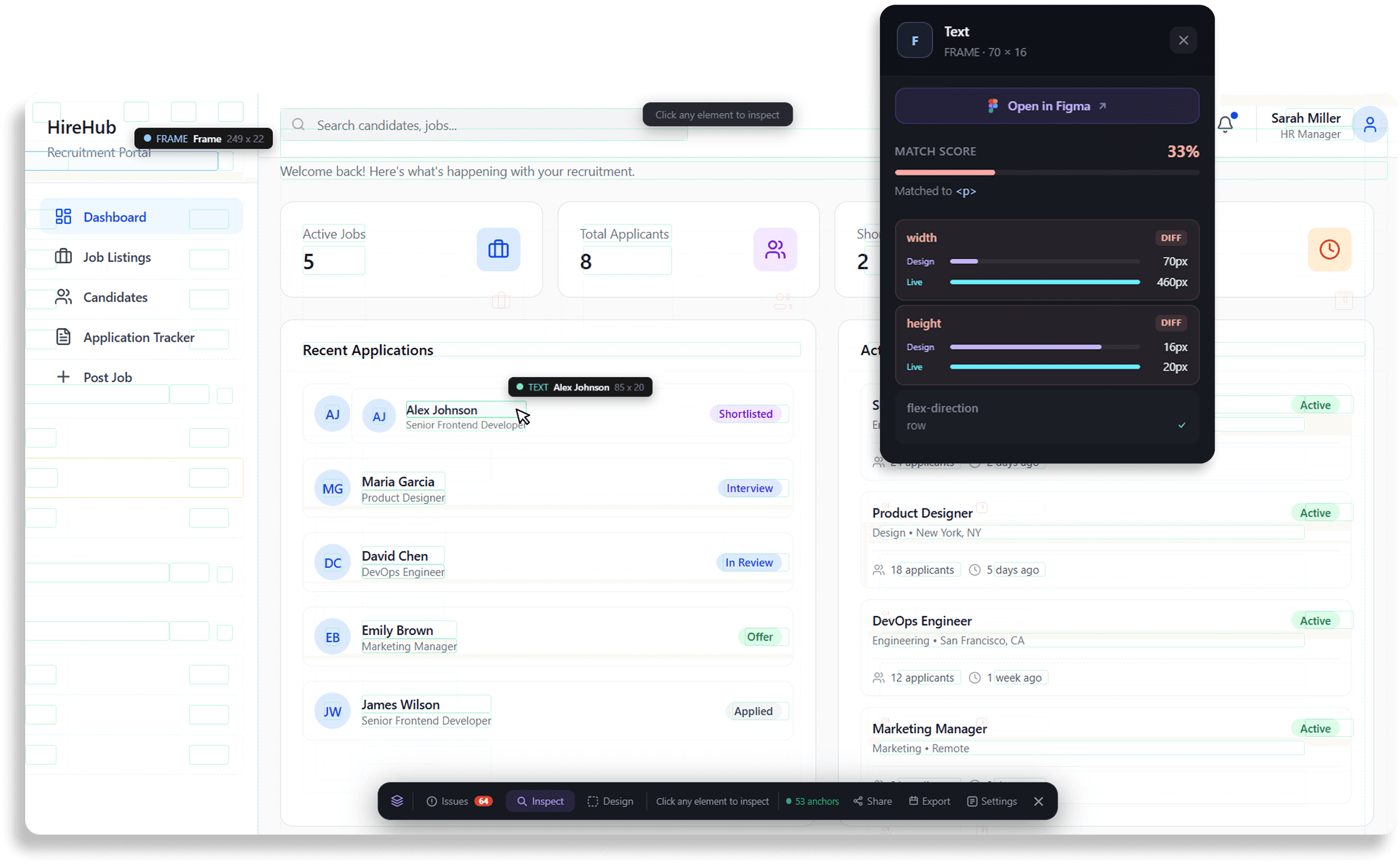 Hover over any component to see a side-by-side overlay of Figma specs vs. your actual CSS implementation.